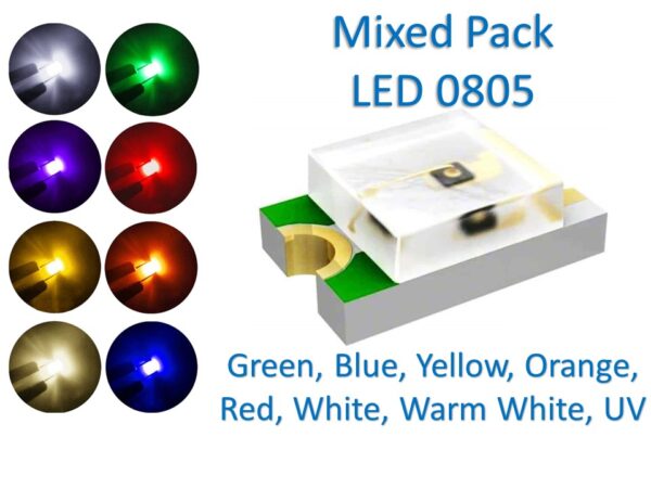 0805 LED Mixed eight different colours. Red, Green, Yellow, Orange, White, Warm White, Blue and UV(purple)15.95. They are small and usually used as a soldered surface mount light source.
