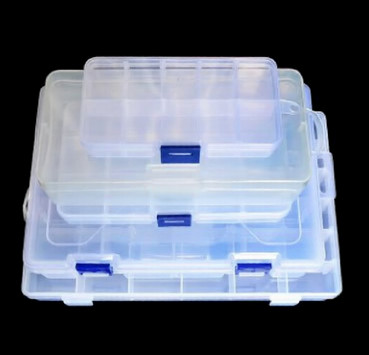 27 x 174 x 100 mm Transparent Plastic Grid Box Storage. This compact storage box features 15 compartments. Each compartment size can be changed as the Divider can be removed, making them ideal for storing small passive electronic components like ceramic capacitors, TO-92 transistors, Mini Reels -SMD components, etc
