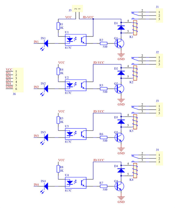 Please note: Note: Maximum contact voltage depends on the type of load The relays used are usually Songle or Tongling, both of good quality and exact specifications As shipped, the module has a jumper between header pins JD-VCC and VCC (relay power is jumpered to logic power). |