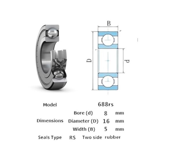 This 688zz Ball Bearing (5x16x8). This bearing is reliable due to being double shielded, which prevents contaminants from entering and conserves lubricant.