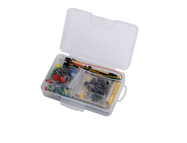 A low cost components starter kit which comprises of the most commonly used resistor values, potentiometers, switches, LED’s and Header terminal strips