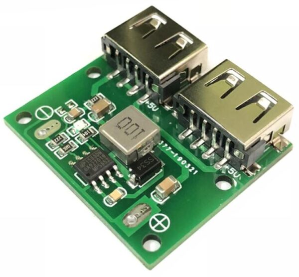 - The module has two USB outputs that simultaneously provide a stable 5V DC output on both channels.