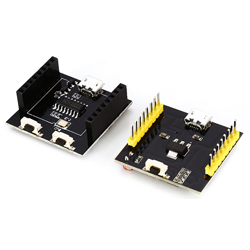 The upper board is the main board which consists of an ESP-12F module – where the ESP8266 Wi-Fi microcontroller is located, an RGB LED, an LDR, a button, a micro USB port, and a 3.3V voltage regulator. The lower board mounts the CH340G USB-to-UART module that allows connection with a computer to the ESP8266 for programming the flash or for seeing debug messages. There are other two buttons RST (reset) and FLASH, and a micro USB port.