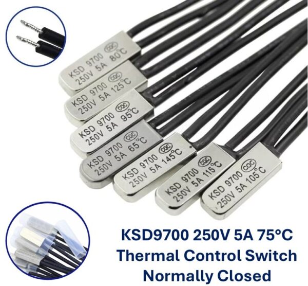 The KSD9700 250V 5A 75°C Thermal Control Switch, Normally Closed, is a compact bimetallic temperature switch that protects electrical appliances from overheating.