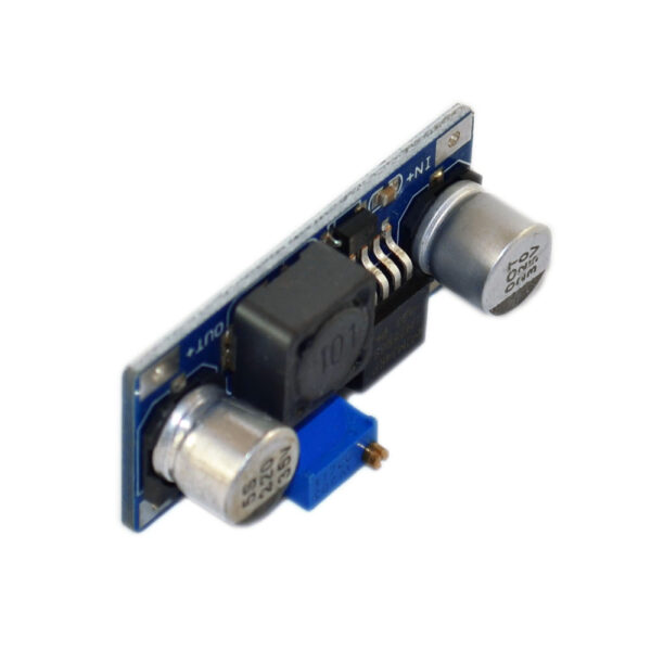This LM2596 DC-DC step-down power module converter accepts input voltages from 3.2V to 40V and outputs a lower voltage from 1.25V to 35V. Output is adjusted via a multi-turn potentiometer. Use it to run lower voltages from your higher power supply. (e.g. run 5V devices from a 12V supply)