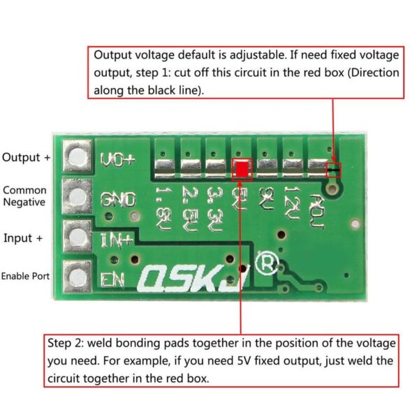 Note: The module’s default output is the adjustable mode. If you want to use the switch from the default adjustable output mode to the fixed output mode, you will need to cut the wire located on the PCB at the red sphere.
