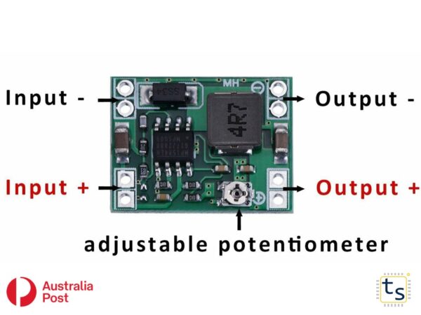 This DC-DC step-down module is based on an MP1584EN chip, this is capable of driving a 3 A load and converts input voltage between 4.5 V to 28 V into a smaller voltage between 0.8 V to 20 V.