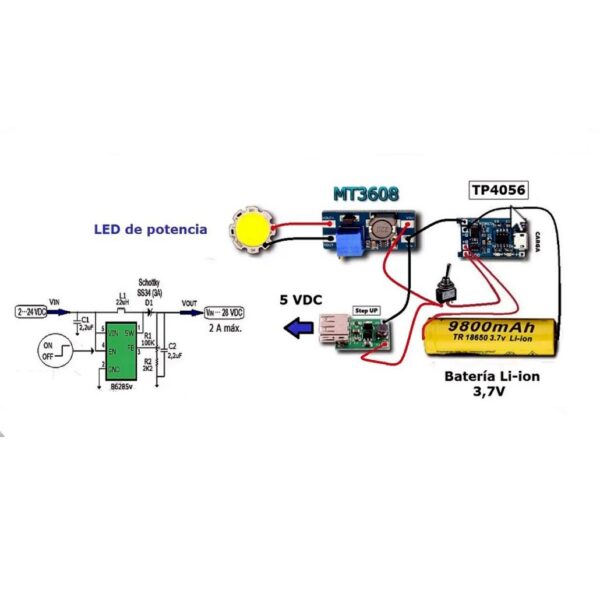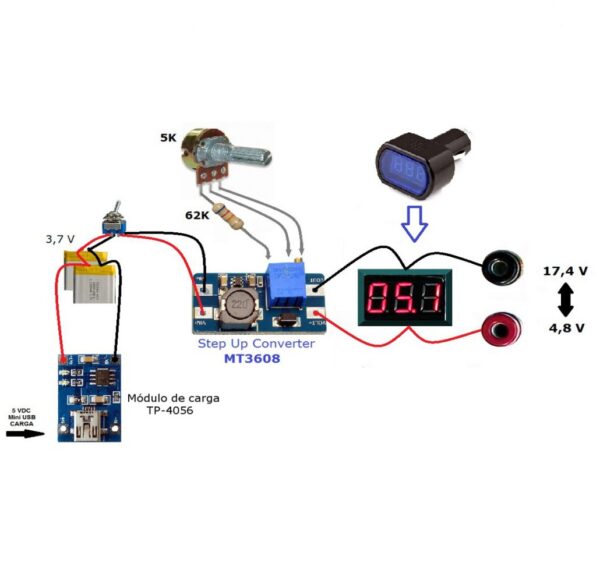 MT3608 Step-Up Adjustable DC-DC Switching Boost Converter can take input voltages as low as 2V and step up the output to as high as 28V.