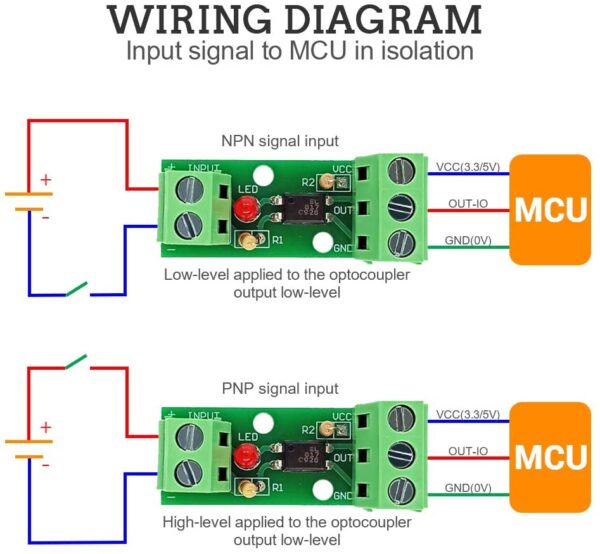 PC817 Optocoupler Isolation 3.3V 5V, 12V, and 24V can be very helpful in protecting your sensitive devices, such as microcontrollers and FPGAs, from noise and higher voltages present when using Motors, Relays and other actuators. This breakout board helps to add opto isolation to any circuit with a minimum amount of wiring.