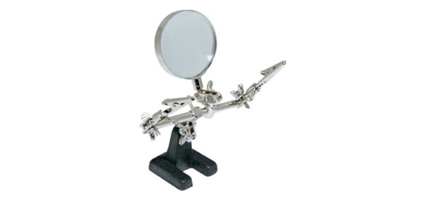 PCB Holder Solder Stand And Magnifier has dual clamps and clips that move 360°, allowing great flexibility for holding items, including PCBS, connectors, cable ends, wire, etc. This model features a magnifying glass for component identification and PCB inspection.