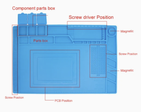 Silicon Insulated Soldering Work Mat S-160 has three small magnetic areas and is a specialized tool used in electronics repair, soldering, and other technical work requiring heat resistance and protection of delicate components.
