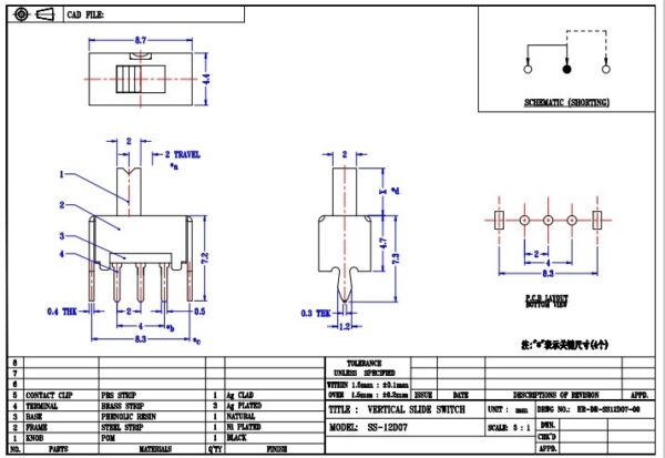 SS-12D07 G4 PCB Mounted Miniature Vertical Slide Switch