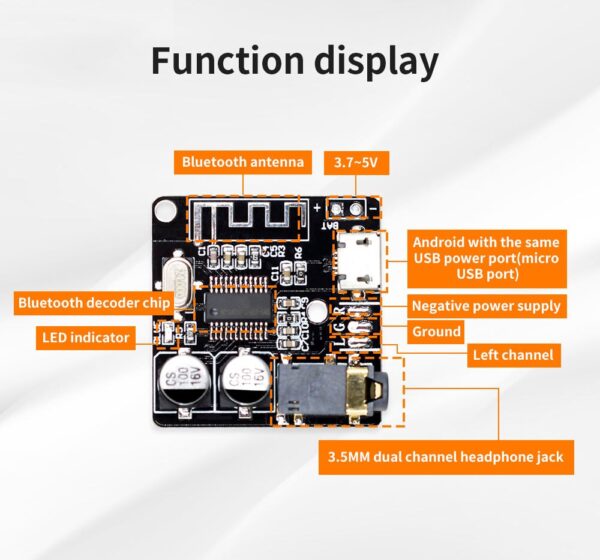 VHM-314 Micro USB Bluetooth 5.0 Audio Receiver Board MP3. This compact and cost-effective Bluetooth 5.0 audio receiver module supports an automatic reconnect function. A micro USB or a 3.7V lithium battery can power it. With this module, you can easily convert your old speakers into wireless Bluetooth speakers.