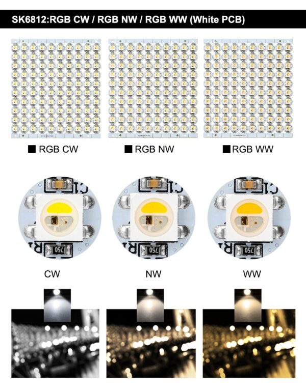 | Model | SK6812 – RGBCW, SK6812 – RGBNW, SK6812 – RGBWW, WS2812B Black PCB, WS2812B White PCB |